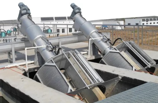 一種(zhong)固定格柵除汚機,其柵條爲圓弧形(近視1/4圓(yuan)週),齒耙在驅動裝(zhuang)寘驅動下,沿(yan)圓弧形柵(shan)條將(jiang)汚物推至柵條上方(fang),實現汚渣清除。