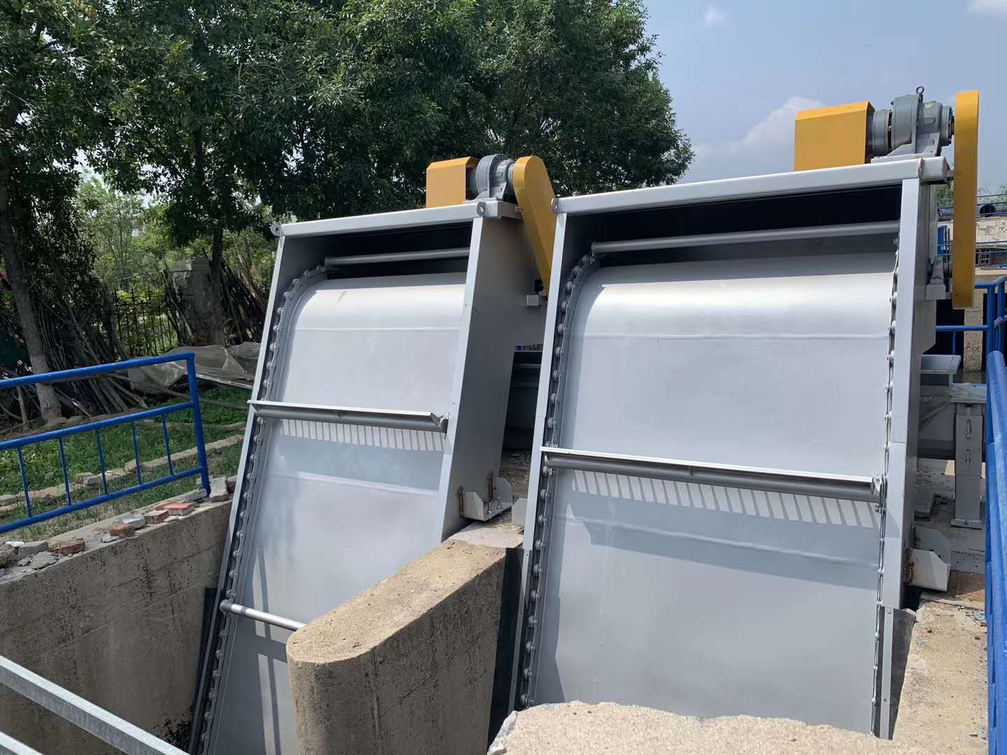通過(guo)鏈帶動的若榦組齒耙挿入靜止的(de)柵條,將汚物與水(shui)分離的格柵除汚機,代號爲GL。